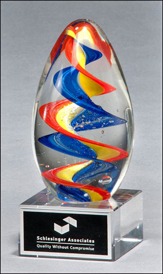 The Egg-Shaped Art Glass Award is a colorful hand made egg-shapedshaped glass piece with blue, yellow and red accents, on a clear glass base. This award is 2.75" wide and 6" high. An engravable plate has space for up to 4 lines of engraving. The engraving is only $1 per line extra! A truly unique award suitable for any award giving occasion. These awards are individually gift boxed. Due to the handmade nature of these awards, air bubbles and color variations are common.