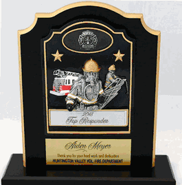 Our Firefighter Stand-Up Plaque Award is a uniquely designed award in that it has the features of both a plaque and a trophy. The award stands 10.5" high with a base of 10.5" wide and 3.5" deep. The ebony finished wood plaque is highlighted with a goldtone finished beveled edge and features a hand painted resin firefighter appliqué. A prestigious award to be presented and received with pride. The two engraving areas are laser engraved for only $1 per line, not per letter or word!
